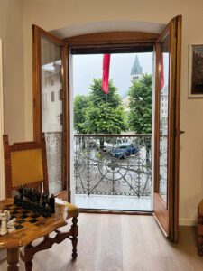 Un ampio appartamento nel Palazzo settecentesco nel quale la Regina Margherita di Savoia desiderosa di visitare il Cadore, non solo per scopi politici, si affacciò dal poggiolo (foto sotto) per salutare i sudditi che la acclamavano. Arrivò con il Principe nel primo pomeriggio accolta dagli spari di mortaretti e dal suono delle campane oltre che dalla folla. Fu scelto questo Palazzo, all’epoca bella casa dell’ ing. Luigi De Candido perchè si trovava in uno dei più bei punti della piazza e della via di Santo Stefano di Cadore che per l’occasione era stata tappezzata con arazzi, bandiere, fiori ed iscrizioni. Venne accolta dall’assessore Giovanni Bergagnin che faceva le funzioni del Sindaco che per l’occasione era vestito alla buona in panno nero, trovandosi per la prima volta ad indossare i guanti.